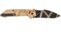 La Extrema Ratio BF2V tiene una hoja relativamente corta con punta de tanto. Como el mango es algo más largo, el cuchillo también ofrece mucho agarre para las manos grandes. Los círculos fresados ofrecen un agarre adicional. Es una característica agradable que también se ve hermosa. La estructura abierta del cuchillo permite limpiarla fácilmente. Esto es importante si, por ejemplo, la BF2V entra en contacto con agua salada.