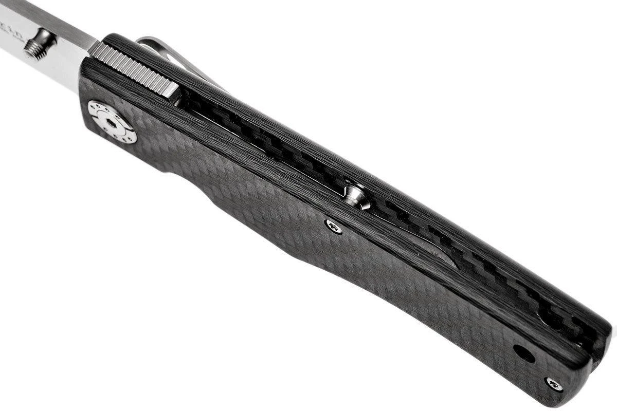 La Maserin Carbon 392 es una navaja ligera con un diseño excéntrico. La forma del mango parece poco ortodoxa. ¿Se siente bien en la mano? ¡Sí! Los dedos índice y medio tienen un agarre perfecto y el anular y el rosa se ajustan perfectamente al resto del mango.