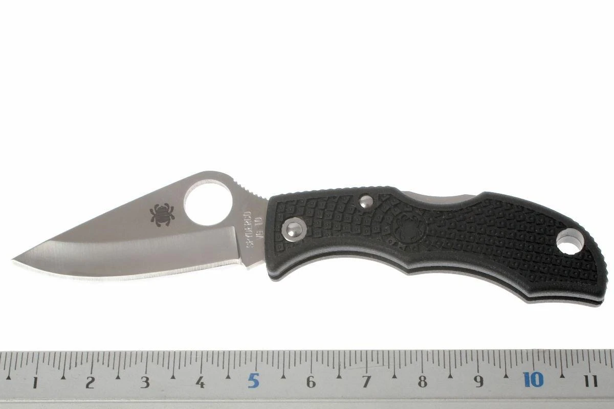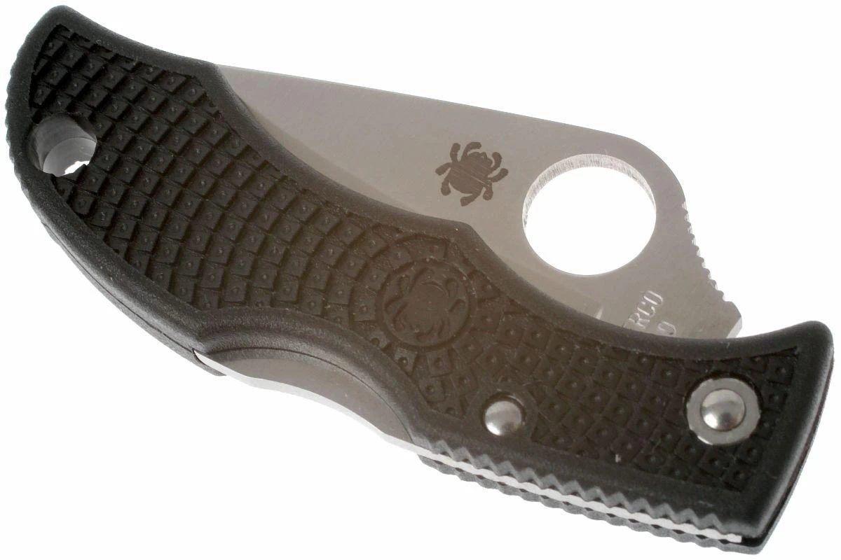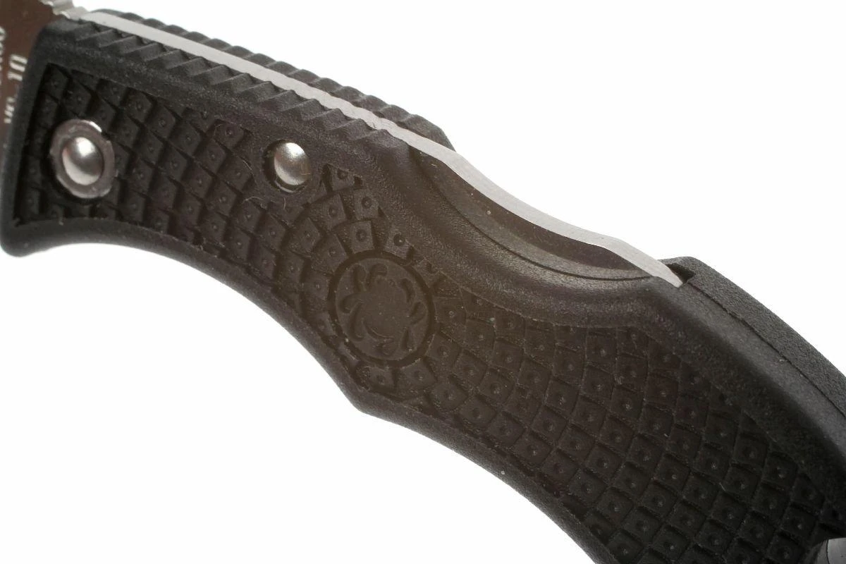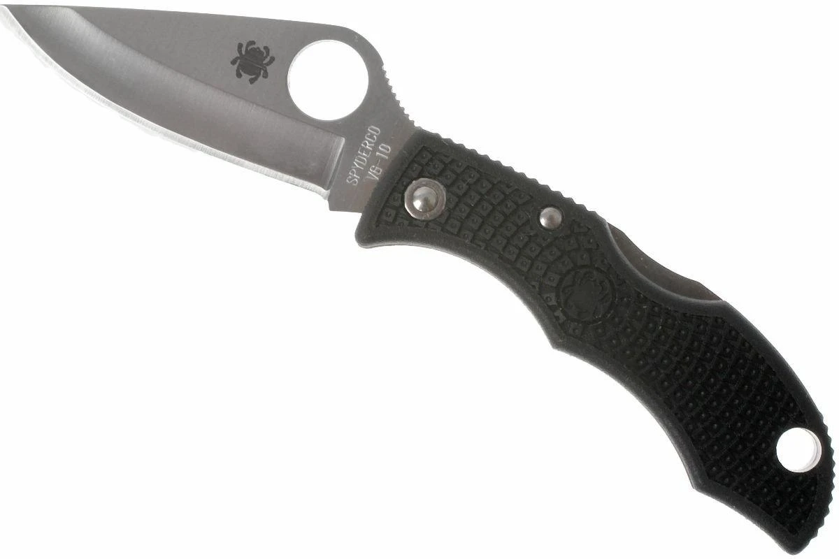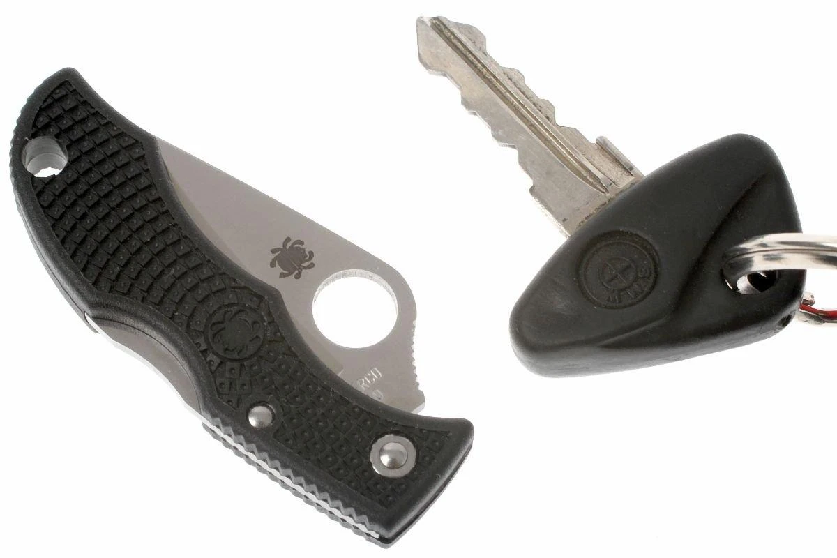 Cuchillo de llavero increíblemente compacto. Sin embargo, sigue siendo un verdadero producto Spyderco, con nada menos que una hoja de acero VG10, un mecanismo de bloqueo backlock y un mango FRN. Esta pequeña joya, obviamente, no tiene un clip de bolsillo, sino un agujero para llavero.